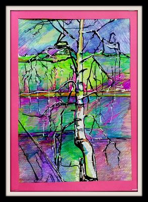 картина с национальным русским пейзажем, русскими березками,весенний пейзаж,создана мною цветными гелевыми ручками,оформленав пасопрту и раму,формат а4