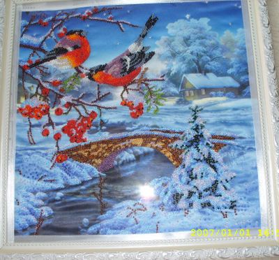 Работа выполнена японским бисером (30 цветов). Частичная вышивка. Ткань- атлас. Очень красивый зимний пейзаж с морозными узорами. Изящество и изысканность. Привлекает внимание тонкостью и красотой, любуешься и наслаждаешься картиной. Высылается без багета, в целях экономии за пересылку и во избежании поломок (в исключительных случаях возможна пересылка с багетом и стеклом, по индивидуальной договоренности). Возврат и обмен не предусмотрен. При желании покупателю предоставляются дополнительные фотографии.