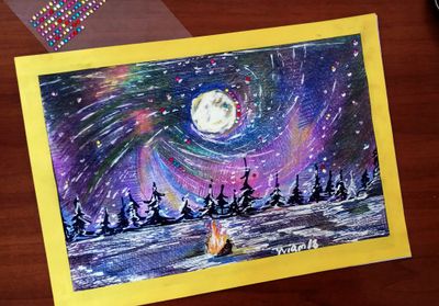 яркая,эмоциональная, необычная, ромнатичная картина, раскрашена цветными карандашами,а изображен странник- путшественник под вечным небом,звездным небосводом и согревающийся у костра
