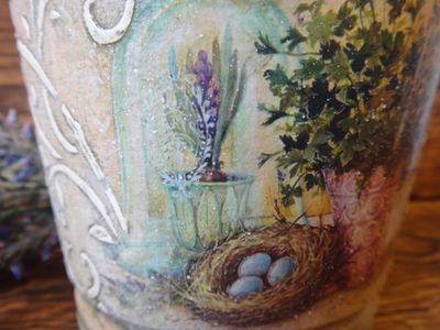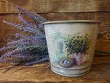 Винтажное кашпо с изысканными картинками. Выполнено в технике декупаж, объёмный рельеф по трафарету. Деликатное состаривание. Возможно изготовление на заказ с учётом Ваших пожеланий по выбору заготовки и картинки.