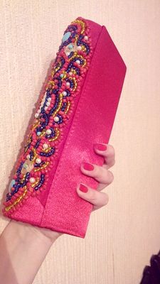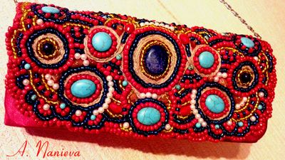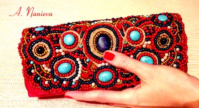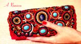 Красный атласный клатч, расшитый натуральными камнями, бисером и джутовой нитью. Материалы: бисер, бирюза, лазурит, бусы, клатч, янтарь, джутовая нить, тигровфй глаз.