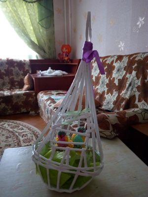 Клетка выполнена из газетной лозы. Птички сделаны из пряжи.