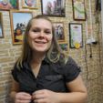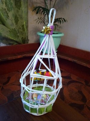 Клетка выполнена из газетной лозы. Птички сделаны из пряжи.