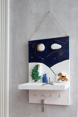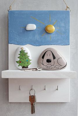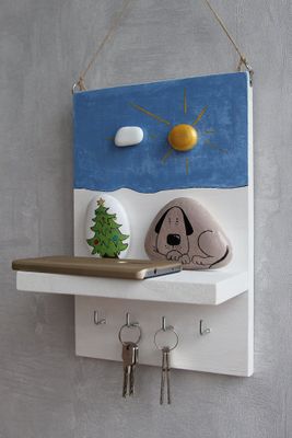Ключница изготовлена из натуральных материалов: массива сосны, морского обкатанного камня. Рисунок по массиву и камню выполнен вручную.