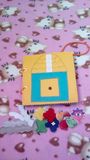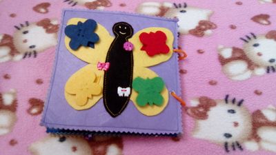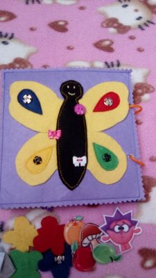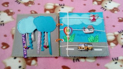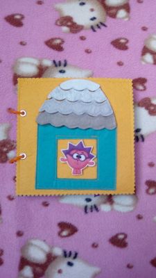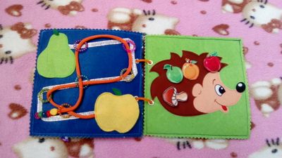Книжка 15*15 см, 3 листа, 6 страниц. 1лист- ежик на кнопке и крыша домика на липе в несколько ярусов для моторики и соображалки деток; тучки шуршат, они с дождиком для тактильного восприятия+спрятаны предметы за ними. 2лист-знакомство с транспортом, все можно подвигать; гусеничка через колечки ползет от яблока до груши. 3лист-ежик с фруктами (липа, кнопки, крючок); бабочка по цвету находим к каждой кнопке. 3лист-