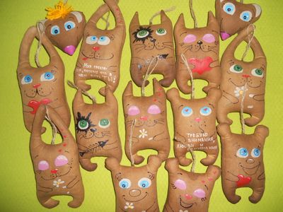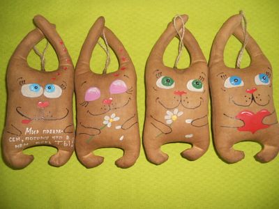 Кофейные котики, зайчата, медвежата, мышата - сердечки. Игрушки обладают приятным ароматом кофе и корицы. Милые, забавные, влюбленные, пираты. На некоторых игрушках имеются забавные и милые надписи. Необычный подарок и мужчине, и женщине, и юноше, и девушке, и ребенку к дню Святого Валентина, 23 февраля и 8 марта. Веселые игрушки поднимут настроение, создадут уют. На каждой игрушке имеется петелька для подвешивания игрушки в машине, на кухне, в комнате... Размер котиков 16*8 см, размер медвежат 15*8 см, размер зайчат 20*8 см, размер мышат-сердечек 9*9 см . В наличии. Цена указана за одну игрушку.