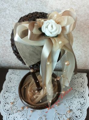 Кофейный топиарий-дерево счастья- с бантиком ,лентами и жемчужной нитью Высота около 27см