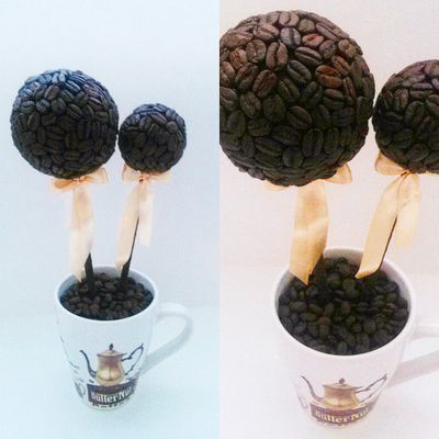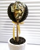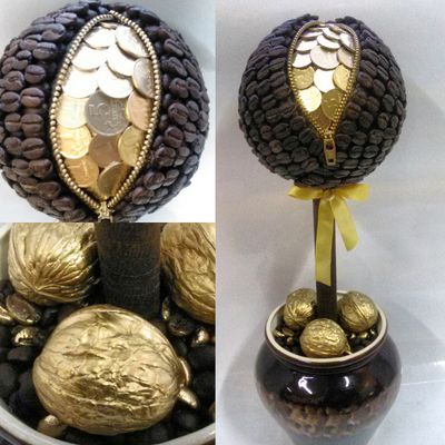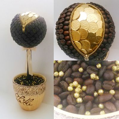 Кофейный топиарий выполнен из натуральных кофейных зерен с добавлением настоящих монет.Высотота 35см.В кружке 700 рублей.