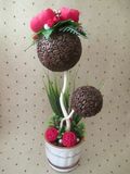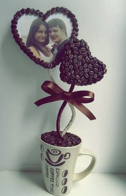 Кофейный топиарий "Флюиды".В кроне топиария два слоя кофейных зерен. Благодаря этому в мелких просветах между зернышками не видно основы.Розы сделаны вручную из фоамирана.Такой топиарий отлично впишется в интерьер гостиной, спальни, кухни и станет хорошим подарком близкому человеку.Выполненный из натуральных кофейных зёрен,он издаёт изумительный,приятный аромат кофе) Работа на заказ Срок изготовления: 3 дня Материалы: кофейные зёрна, фоамиран, керамический горшок, сезаль, атласная лента, бадьян, репсовая лента, жемчуг искусственный, тейп-лента, флористическая проволока