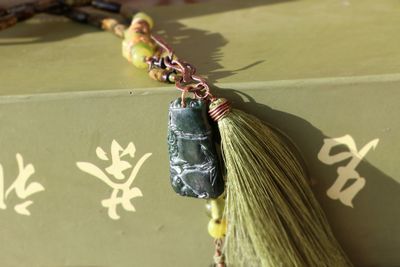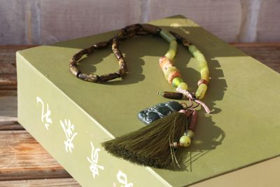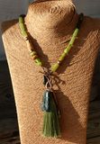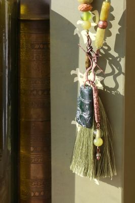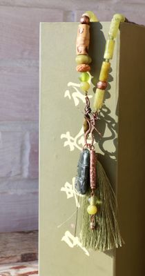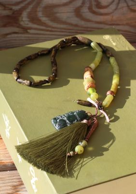 Длинное колье в стиле шинуазри из натуральных материалов в зеленых тонах. Основная часть украшения состоит из трубочек нефрита и семян. Застегивается спереди на тогл из меди (в верхней его части). На нижнюю подвешены резной нефрит, шелковая кисть и медная трубочка с бусинами. Длина колье 67 см., кисть 8 см., кулон 2,5х4 см. Материалы: нефрит, стеклянные бусины, шелковая кисть, медь, кость, змеевик, семена, бамбук.