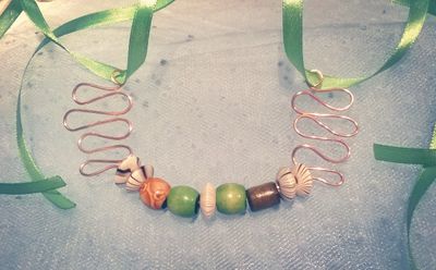 Медь, деревянные бусины, лента