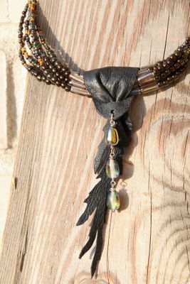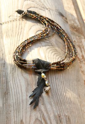 Легкое колье из бисера и чешского стекла с подвесом. Концевики и листик выполнены из темно-синей очень мягкой кожи. Контраст между спокойной матовостью кожи и сверкающей радугой чешского стекла выглядит очень эффектно. Колье можно носить в повседневном варианте, без подвеса, а можно и с ним. Длина 45-55 см. подвес 10 см. Материалы: бисер, чешское стекло, кожа, металлофурнитура. Гало – оптическое явление, ореол возникающий вокруг луны или солнца в сильные морозы. .