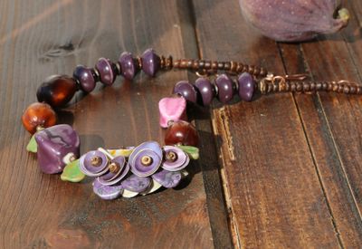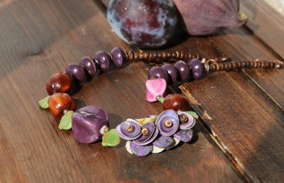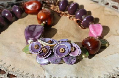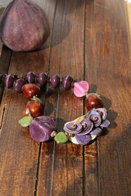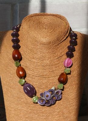 Длина 45-55 см. Материалы: керамические бусины, кокос, чароит, стеклянные бусины, семена, металлофурнитура. Асимметричное колье из множества керамических бусин и экзотических материалов. Сочные фиолетовые-розовые фруктовые оттенки разбавлены зелеными листиками из чешского стекла. Центральная гроздь собрана из шапочек-ракушек и лепестков чароита. Колье довольно увесистое и массивное, но комфортно лежит на шее. Хорошо смотрится и под шею, и немного ниже. С удлиняющей цепочкой.