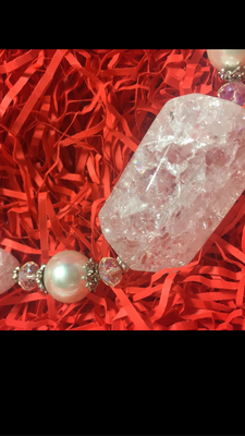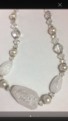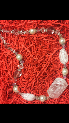 Колье собрано вручную из натуральных камней (горный хрусталь, чешское ювелирное стекло и майорка) на ювелирном тросе. Длина колье: 53 см.