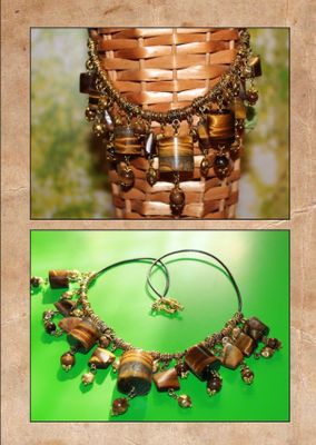 Тигровый глаз, бусины ввиде бочонков, квадратов, круглые бусины, фурнитура под черненое золото на кожаном шнуре, длина изделия-50 см, замок карабин. Будьте дерзкой и яркой в этом колье