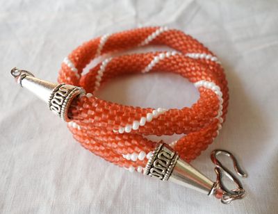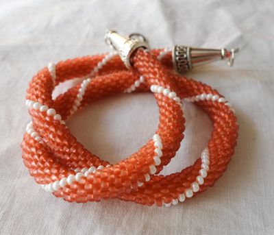 Жгут сплетён тоже из очень приятного на ощупь бисера, шуршащего в руках. Можно носить, можно просто крутить между пальцами. Длина (с замочком) - 48 см