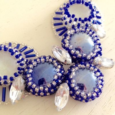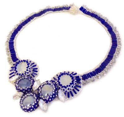 Колье из синего стекляруса и бисера, прозрачных страз и камней, на леске. 43 см в длину