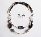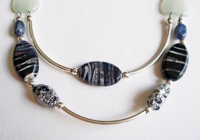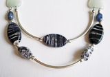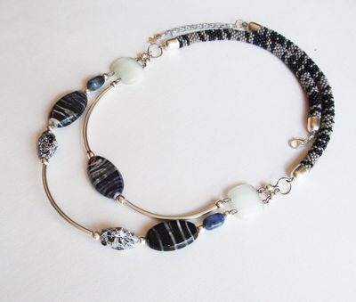 Колье Вечернее рандеву изготовлено из натуральных камней агата и содалита, металлических и декоративных бусин, и жгутов, выполненных в технике вязание из качественного чешского бисера на хлопковой нити "canarias". Длина колье по внутреннему диаметру 57 см., цепочка удлинитель 6 см.