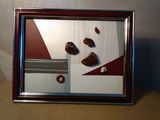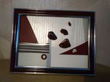Абстрактный коллаж с использованием натуральных камней-красной яшмы.пейзажной яшмы , кахолонга и элемента из дерева..Картина размером 18смх23см в деревянной рамке,окрашенной в цвет бордо и серебро,покрыта лаком.Фон-основа -коллаж из пленки ПВХ.На обратной стороне-краткое описание свойств камней.Лаконичность и динамизм композиции заряжают энергией на новый день.