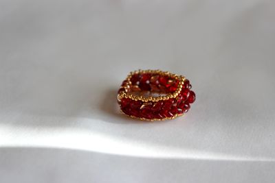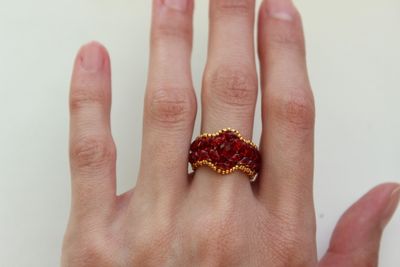 Кольцо из чешского бисера Твин/СуперДуо красно-золотого цвета и японского бисера MIYUKI золотого цвета. Размер примерно 16-17, возможно выполнение под заказ любого размера.