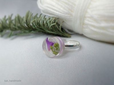 Колечко цилиндрической формы. Внутри цветочек статицы и неизвестное мне зелёное растение(подскажите, если кто знает). Размер регулируется, минимальный 16-17. Диаметр декоративной части 1см, фурнитура металлическая.
