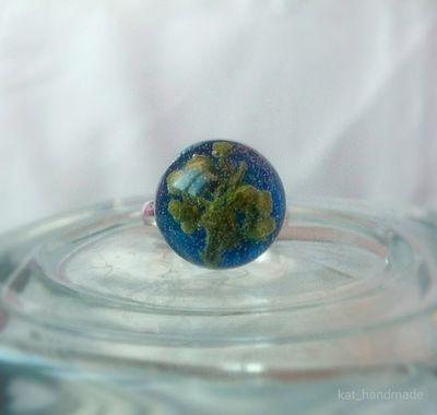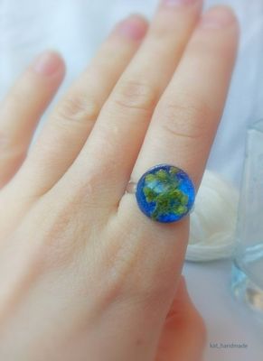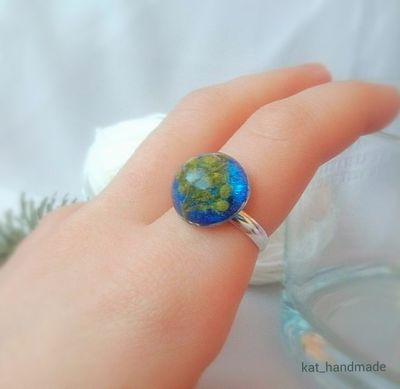 Колечко полусфера с веточкой зеленого растения. Для меня немного необычное оформление, а вообще получилось забавно. Под углом фон отливает голубоватым. Фурнитура металлическая под серебро. Размер регулируется.