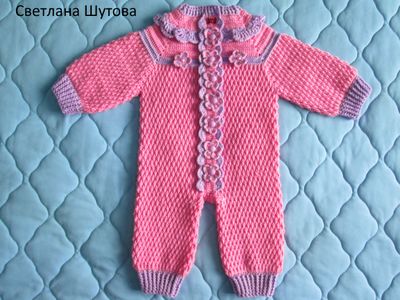 Комбинезон от 2 до 6 мес. Выполнен плотной вязкой из детского акрила. Ширина 27 см, длина 58 см.