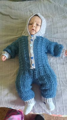 комбинезон может выполнится как из теплой пряжи, так и из более тонкой ( для носки в теплое время). На фото представлен на пуговицах, возможно сделать на молнии