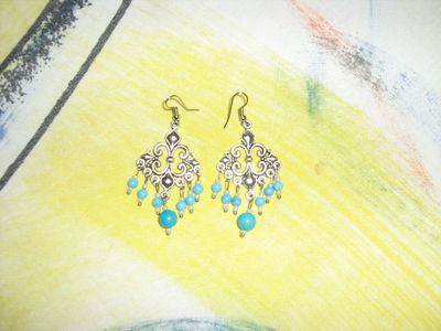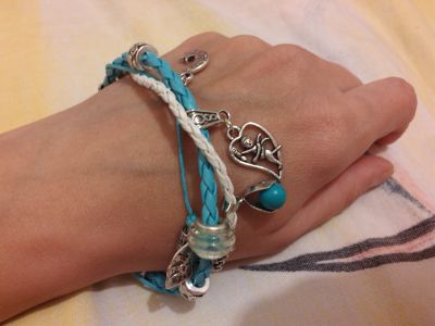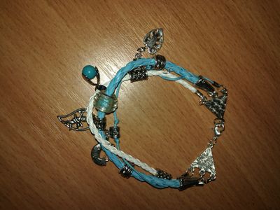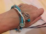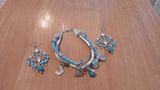 Браслет на плетеных шнурах, украшенный подвесками, бусинами в стиле "Пандорра", а также подвеской из натуральной бирюзы. Серьги из бирюзы и светлого бисера на узорчатой металлической основе в восточном стиле. Комплект смотрится необычно и оригинально, для стильных девушек, желающих обратить на себя внимание. Возможно приобрести по отдельности серьги или браслет.