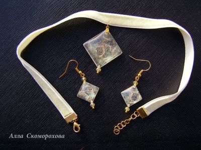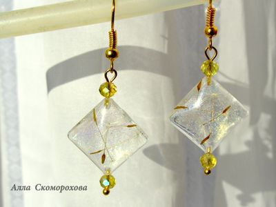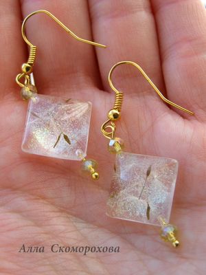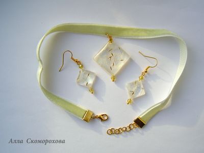 Что делать, если сердце просит праздника, лёгкости, шампанского и салюта? Пожалуйста, мой новый комплект к Вашим услугам! Лёгкость пушинок одуванчика в сочетании с нежными золотисто-зеленоватыми искорками и хрустальными бусинами как раз создаёт ту самую атмосферу. А бархатный чокер придаёт моменту некую торжественность. Длина серёг 3 см, со швензой 5 см. Подвеска 4х3,5 см, длина чокера 32 см + удлинительная цепочка 3 см. Если необходимо, длину чокера можно уменьшить или увеличить.