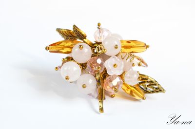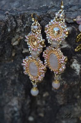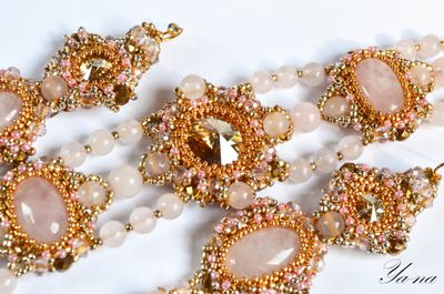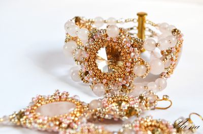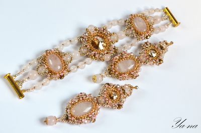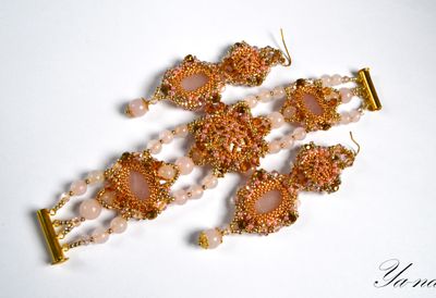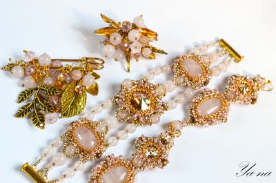 Нежный комплект из золотистого бисера, натуральных камней и риволи Сваровски ищет свою единственную хозяйку! Повтора не будет! Бусины и камни-это розовый кварц. Ажурное плетение, блеск Сваровски придают легкость и изящество. Доставка по России включена в стоимость. Можно приобрести в комплект кольцо и брошь-булавку. За полный комплект сделаю скидку. Материалы: розовый кварц, риволи сваровски, японский бисер ТОНО, хрусталь, металлофурнитура Размеры: Браслет: 17,5 см в длину; 4 см в ширину в широкой части. Серьги:9 см в длину, вместе со швензой и 2,5 см в ширину.