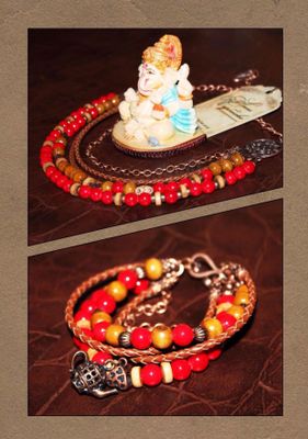 Пятирядное колье из бусин, имитация кораллов красного цвета, деревянных бусин, кожаных плетёных коричневых шнуров, фурнитура под медь. Браслет идёт в комплекте