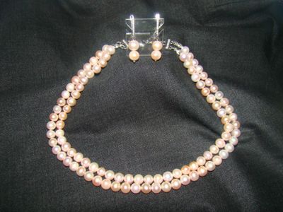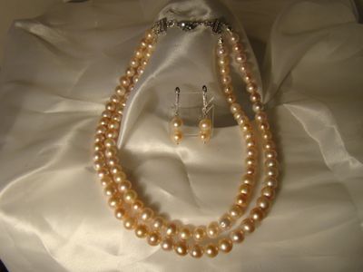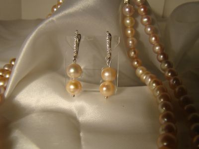 Комплект выполнен из розового жемчуга. Качество АА+. Швензы серег из серебра 925 пробы с фианитами. Цена 6990 руб.
