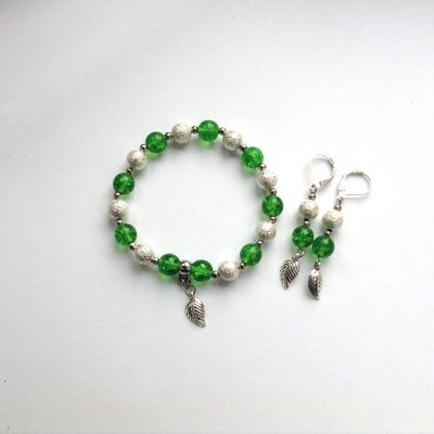 Браслет из стеклянных и металлических бусин на спандексе, с подвеской в форме листика. Серьги с металлической основой.