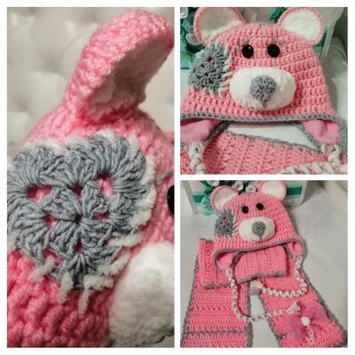 Комплект "Мишка Тедди" на изделие ушло около 1 мотка пряжи NOVA Вebe 100, сделан подклад из тонкого флиса, связан на возраст 6-12 месяцев на обхват головы 44-45 , сама шапочка вязалась на обхват головы 46 см, шарф в длину 85 см в ширину 12. На шапочке расположена объемная мордашка медведя, но она не тяжелая и не вызовет у малыша дискомфорт, в белое основание мордочки добавлен синтепон немного что бы мордочка держала форму. Возможны повторы в любом цвете на любой возраст от 1-5 лет.