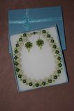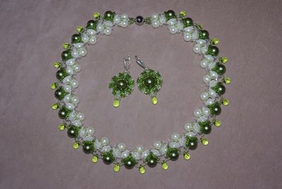 Комплект "Нимфа" 2 предмета (ожерелье и серьги). Комплект подойдет для любого случая. Будет хорошим подарком к Дню рождения или юбилею. Серьги 3, 5 см. с подвеской. Колье 47 см. Материалы: Бусины под жемчуг (Чехия), бисер (Чехия), граненые бусины (Чехия), фигурные бусины капли - (Чехия), фурнитура под серебро (замочек - бижутерный сплав). Швензы - серебро 925 . Комплект может быть приятным сюрпризом, в качестве комплимента любимой девушке или женщине. Сочная гамма в зеленых тонах всегда будет напоминать о весне, когда природа оживает и распускаются первые листочки, а кому то новогодние праздники и припорошенную снегом елочку. Комплект упакован в подарочную упаковку. Оплата на карту Сбербанка или PaiPal (реквизиты в личной переписке).
