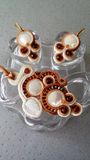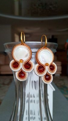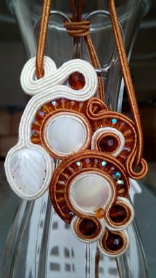 Подвеска и серьги выполнены в технике сутажная вышивка. Материалы: сутаж, перламутр, бусины чешское стекло.