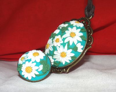 Комплект летний "Ромашковый". Создан руками Людмилы. Полимерная глина Sonnet и FIMO, состоит из кулона на кожаном шнурке и кольца (основа кольца безразмерная). Фурнитура цвета бронзы. Кольцо и кулон украшены нежными ромашками из полимерной глины в технике цветочная филигрань.