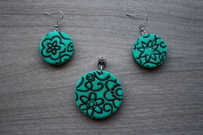 Изготовлен из полимерной глины, покрыт лаком. Диаметр кулона 4 см, серьги 3 см