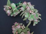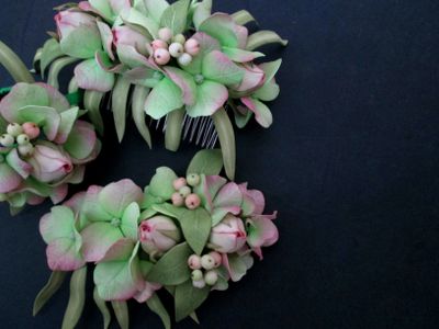 В комлект свадебных аксессуаров входит: - браслет, -бутоньерка, - украшение для волос на гребне. Украшения можно так же использовать для фотосессий. Небольшие бутончики роз в сочетании с цветами гортензии, ягодками снежноягодника из полимерной глины и веточек перечного эвкалипта прекрасно сочетаются в одном изделии. Каждая деталь сделана с огромной любовью, трепетом и терпением. Листики, лепестки и ягодки, это все сделано отдельно и только потом собрано в такую нежную композицию.