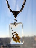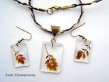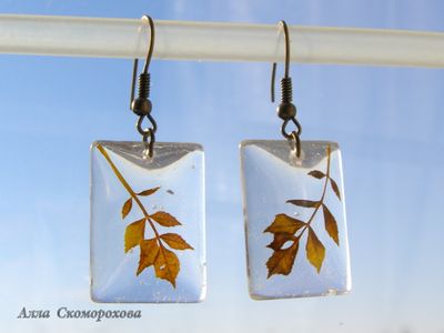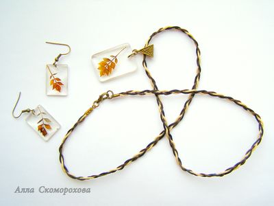 Крохотные веточки листьев, будто замороженные в прозрачных льдинках. И чем лаконичнее дизайн, тем очаровательней эта графичность природных форм. Что можно добавить, чтобы не навредить естественной красоте? Разве только бронзовую фурнитуру, да тройной хлопковый шнур длиной 60 см. Сам кулон 3,2х2,2 см, а серьги 2,4х1,7 см. Они почти не чувствуются при носке, ведь ювелирная смола лёгкая, как пластик.