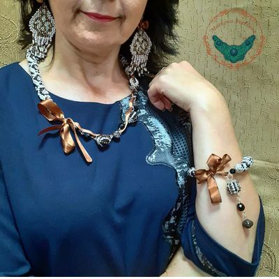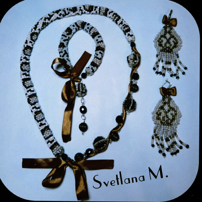 Комплект украшений выполнен из бисера с использованием бусин из бисера и металлических бусин . Роль застёжек выполняют шёлковые ленты, которые придают романтичное настроение. Состоит комплект из колье, браслета и серёжек.