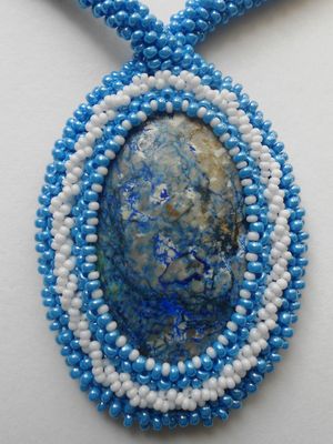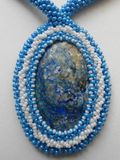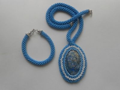 Комплект украшений, состоящий из кулона и браслета. В основе кулона натуральный камень- лазурит, оплетенный чешским бисером. Кулон очень крупный 10*7 см, будет красиво смотреться как в декольтированном вырезе ярко-синего вечернего платья, так и с джинсами и белой блузкой. Подвес выполнен из вязанного бисерного жгута. Лазурит укрепляет тело, ум, сознание и используется для стимуляции всего организма. Его применяют для укрепления сна, снижения артериального давления и высокой температуры, а также при лечении различных воспалений, глазных и нервных заболеваний, при мигренях, астме и радикулите. Считается, что лазурит улучшает протекание беременности. Лазурит символизирует удачу, успех и благополучие. Он помогает воплощению планов и проектов, укрепляет дружбу.
