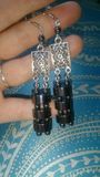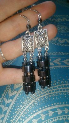 Оригинальные длинные серьги из гематита на застежках из серебра 925пр и браслет на резинке.