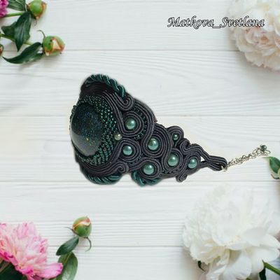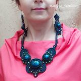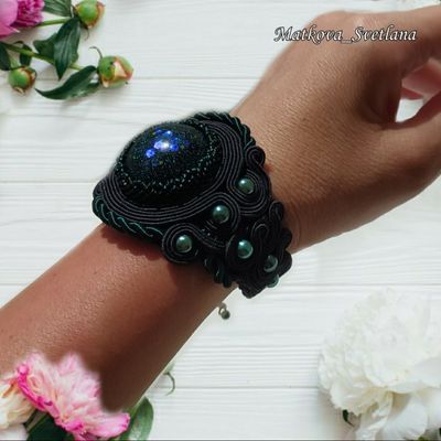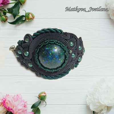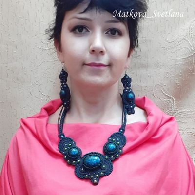 Комплект украшений выполнен в технике сутажная вышивка с использованием кабошонов из эпоксидной смолы. Состоит комплект из колье, браслета и серёжек. Размер браслета 17,5+5 см, ширина 5 см. Серьги длиной 11 см.
