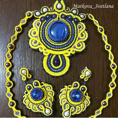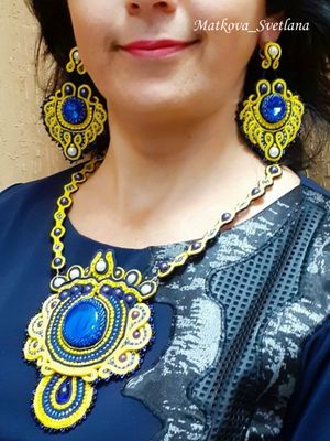 Украшение выполнено в стиле сутажная вышивка с использованием стеклянных кабошонов. Изнаночная сторона натуральная кожа. Комплект состоит из колье и сережек. Яркие, солнечные цвета изделия не оставят равнодушных вокруг Вас.