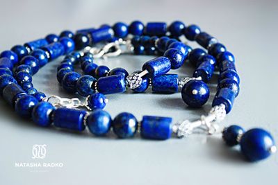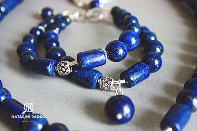 Набор украшений в виде ожерелья и двойного браслета из лазурита. Лазурит-камень успешных, ярких, независимых людей. Барышня в таком украшении будет всегда чувствовать свою привлекательность и уверенность. Лазурит дает мощную поддержку своей хозяйке, защищает, оберегает. Камень сохраняет молодость и красоту. Побуждает к активной жизни. Камни: лазурит в серебре.