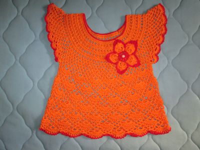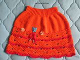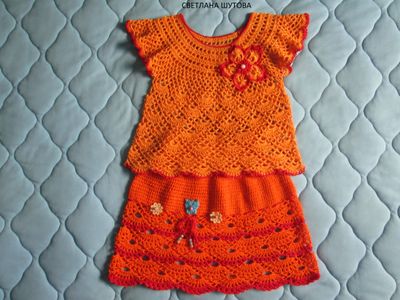 Выполнен крючком, из 100% хлопка. На возраст 3-4 г, рост 98 см. Длина кофточки 36 см, юбочки 30 см.