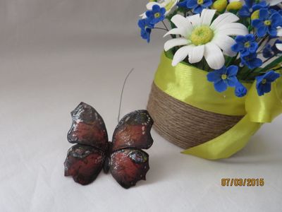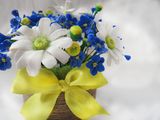 Композиция из полимерной глины, ромашки и незабудки высота 17 см, бабочка выполнена из полимерной глины (6 см).