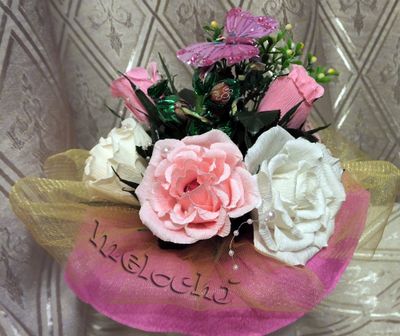 Изготовлю под заказ букет цветов с конфетами. Отличный подарок - и красиво, и вкусно. Кофетка из цветка легко достается, букету это не вредит. Цена букета от 120 руб/цветок+аксессуары